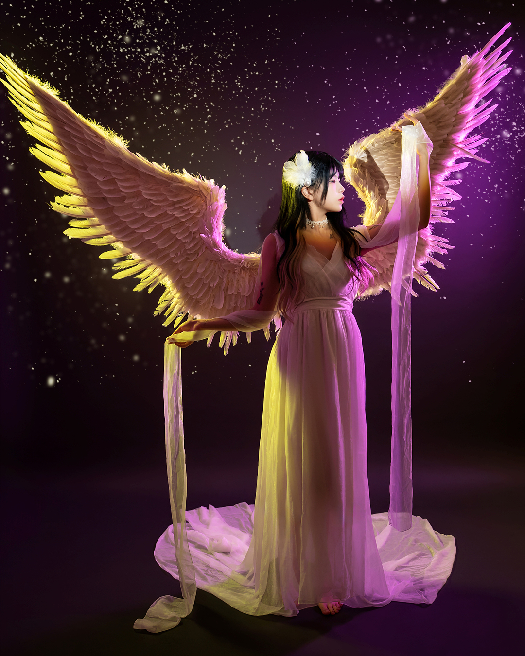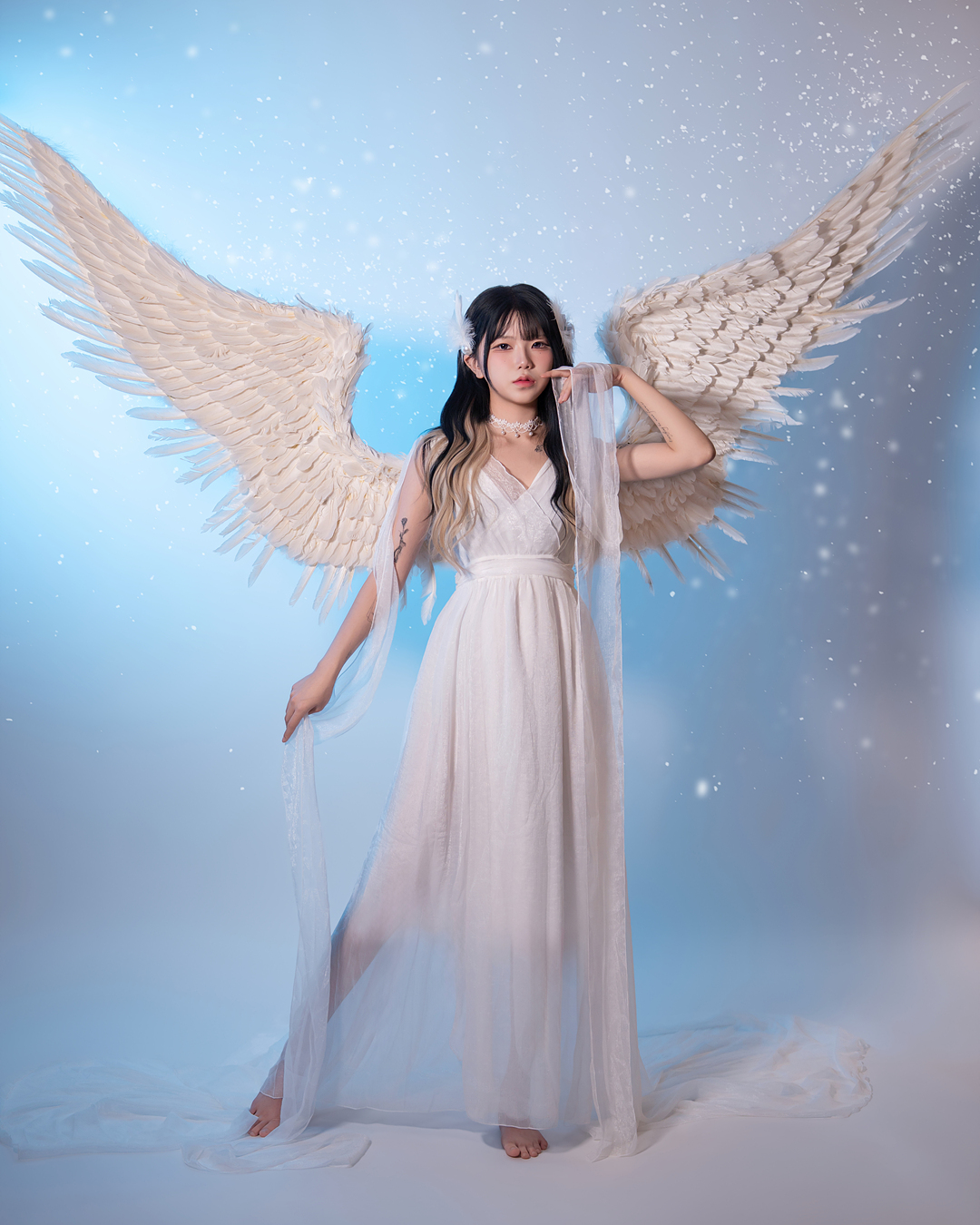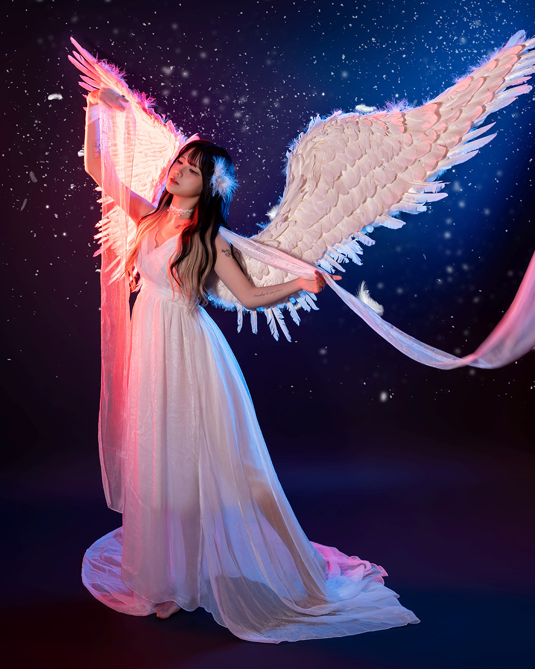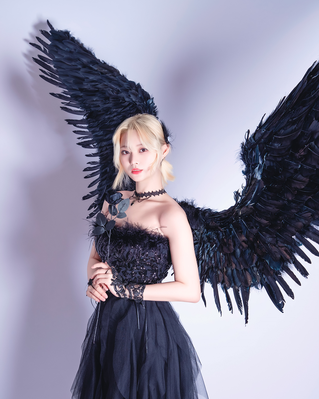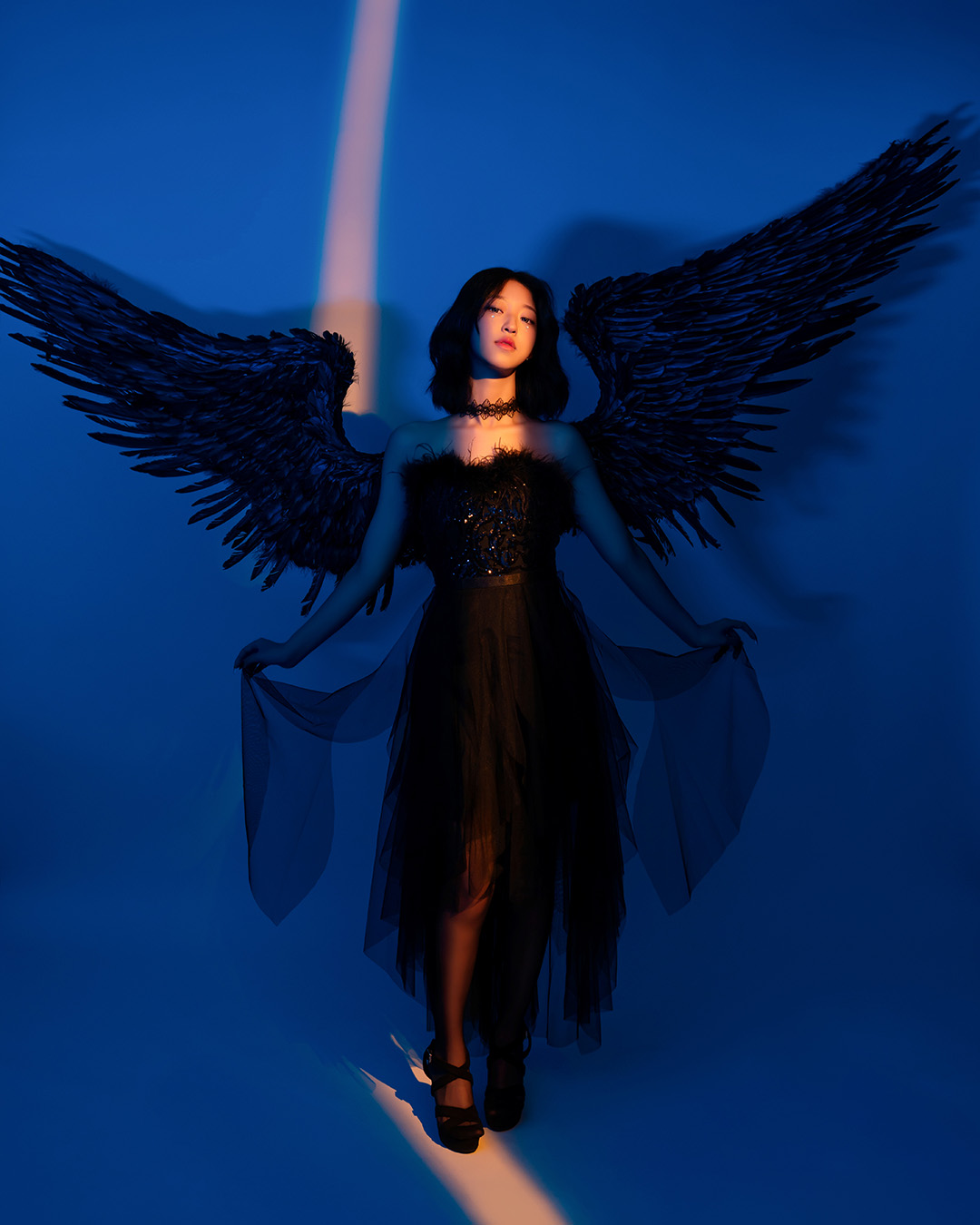 블랙과 화이트 날개를 직접 착용하여 배경지에서 촬영하는 컨셉입니다.